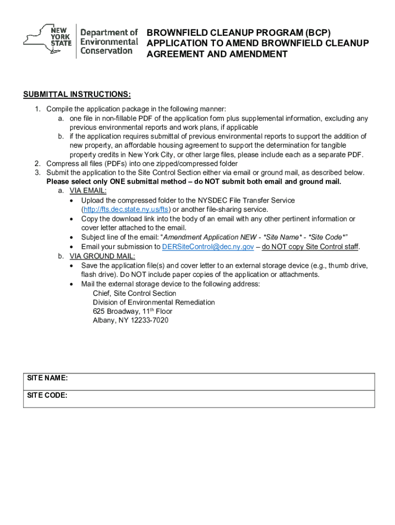 BROWNFIELD CLEANUP PROGRAM (BCP) APPLICATION TO AMEND BROWNFIELD CLEANUP AGREEMENT AND AMENDMENTSUBMITTAL INSTRUCTIONS: 1. Compile the application package in the following manner: a. one file in nonrefillable