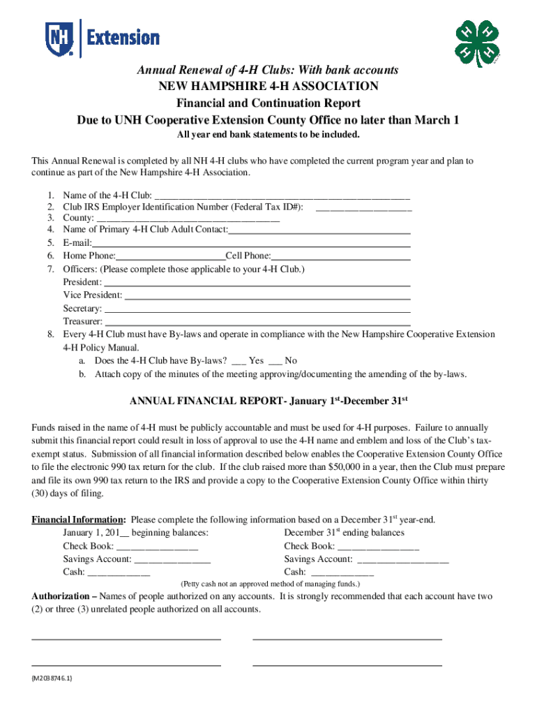 Annual Renewal of 4H Clubs: With bank accounts NEW HAMPSHIRE 4H ASSOCIATION Financial and Continuation Report Due to UNH Cooperative Extension County Office no later than March 1 All year-end bank