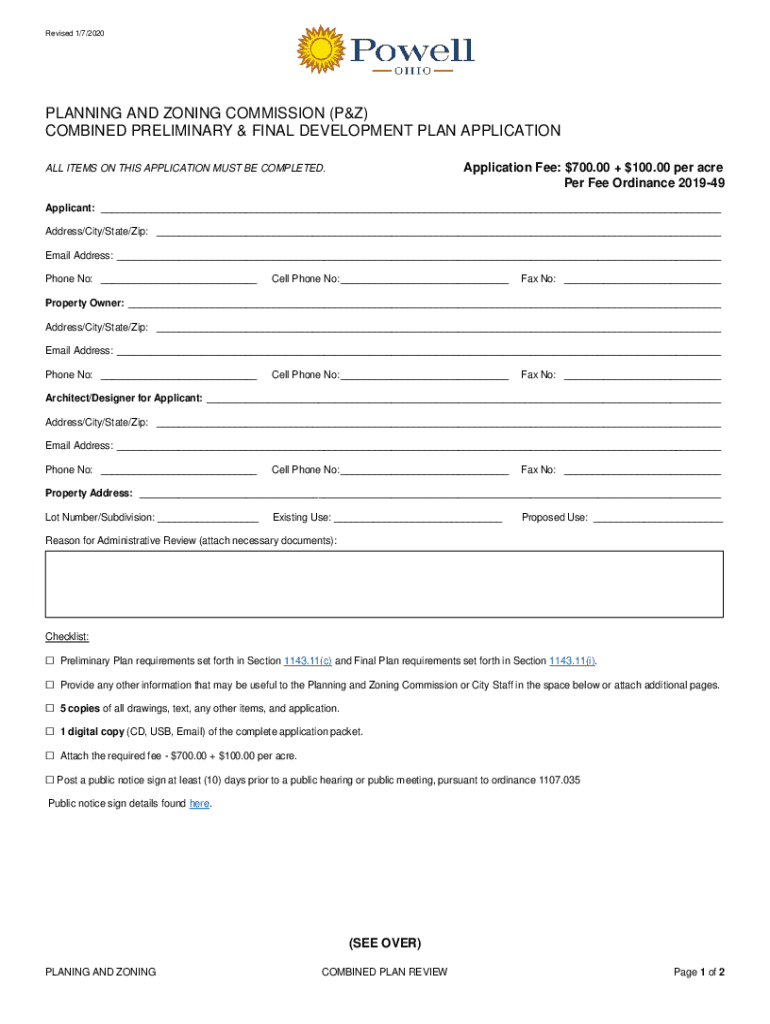 Revised 1/7/2020PLANNING AND ZONING COMMISSION (P&Z) COMBINED PRELIMINARY & FINAL DEVELOPMENT PLAN APPLICATION Fee: $700.00 + $100.00 per acre Per Fee Ordinance 201949ALL ITEMS ON THIS APPLICATION