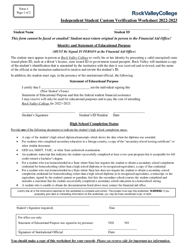 Form 4-Page 1 of 2Independent Student Custom Verification Worksheet 20222023 ______Student NameStudent IDT his form cannot be faxed or emailed! Student must return original in person to the Financial