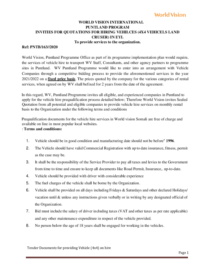 WORLD VISION INTERNATIONAL PORTLAND PROGRAM INVITES FOR QUOTATIONS FOR HIRING VEHICLES (4×4 VEHICLE LAND CRUISER) IN EYE To provide services to the organization. Ref: PNB/163//2020 World Vision,