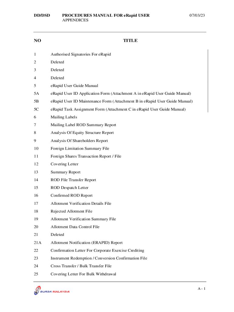 DD/PROCEDURES MANUAL FOR rapid USER APPENDICESNO07/03/23TITLE1Authorised Signatories For eRapid2Deleted3Deleted4Deleted5eRapid User Guide Manual5AeRapid User ID Application Form (Attachment A in rapid