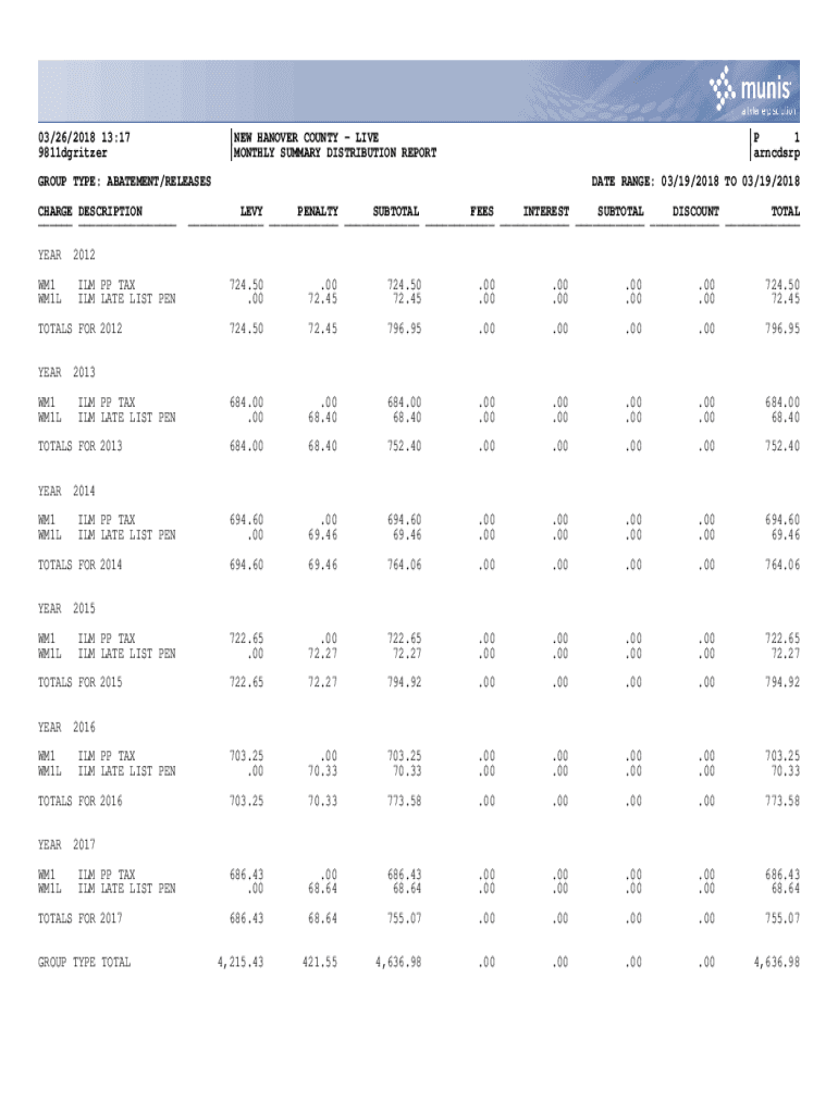 03/26/2018 13:17 9811dgritzer|NEW HANOVER COUNTY LIVE |MONTHLY SUMMARY DISTRIBUTION REPORT|P 1 |arncdsrpGROUP TYPE: ABATEMENT/RELEASES CHARGE DESCRIPTION ___ ___ YEAR WM1 WM1LWM1 WM1LILM PP TAX ILM