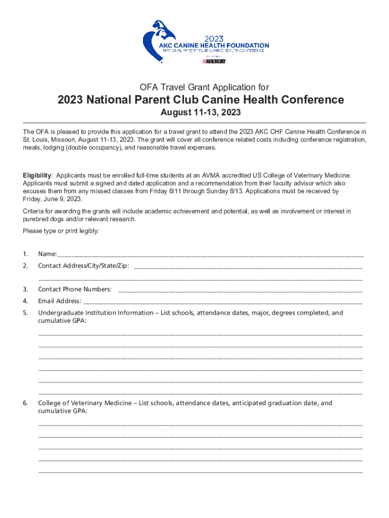 OF Travel Grant Application for2023 National Parent Club Canine Health Conference August 1113, 2023The OF Ais pleased to provide this application for a travel grant to attend the 2023 AKC CHF Canine