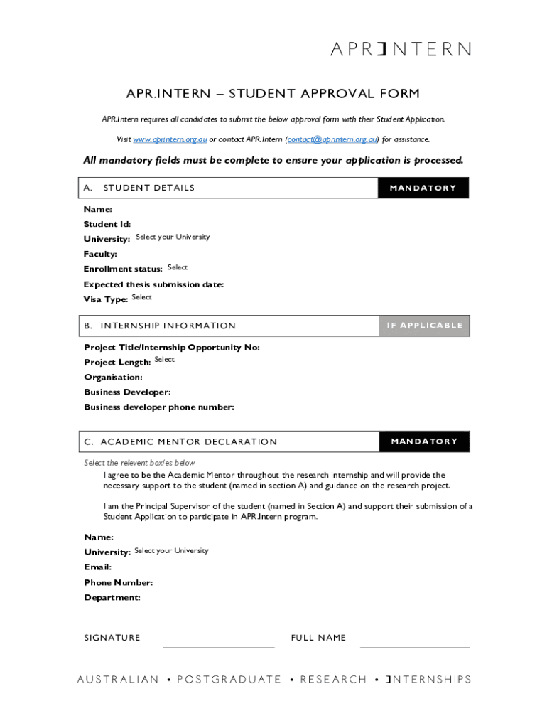 APR.INTERN STUDENT APPROVAL FORM APR. Intern requires all candidates to submit the below approval form with their Student Application. Visit www.aprintern.org.au or contact APR. Intern (contact@aprintern.org.au)