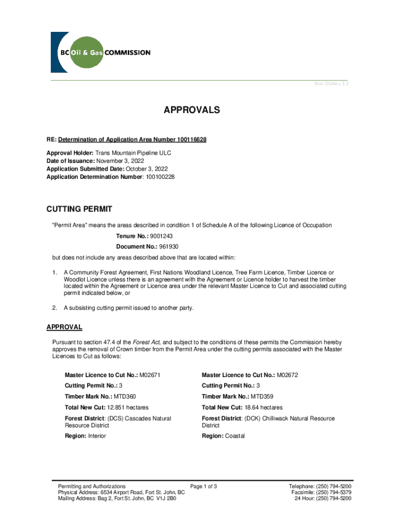 Non GAA v 3.3APPROVALS RE: Determination of Application Area Number 100116628 Approval Holder: Trans Mountain Pipeline ULC Date of Issuance: November 3, 2022, Application Submitted Date: October 3,