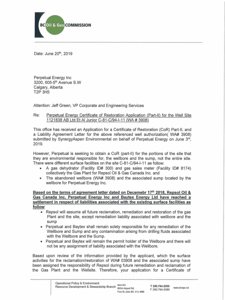 B C t×H W CFB Compassionate: June 20th, 2019Perpetual Energy Inc 3200, 6055th Avenue S. W Calgary, Alberta T2P 3H5 Attention: Jeff Green, VP Corporate and Engineering Services Re:Perpetual Energy