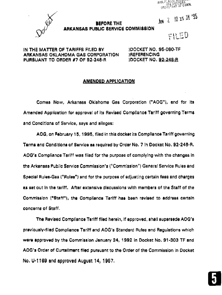 BEFORE THE ARKANSAS PUBLIC SERVICE COMM18SION&;:, p×r\” u1IN THE Master OF TARIFFS FILED BY ARKANSAS OKLAHOMA GAS CORPORATION PURSUANT TO ORDER #7 OF 92248R)DOCKET NO. 95080TF)REFERENCING)DOCKET