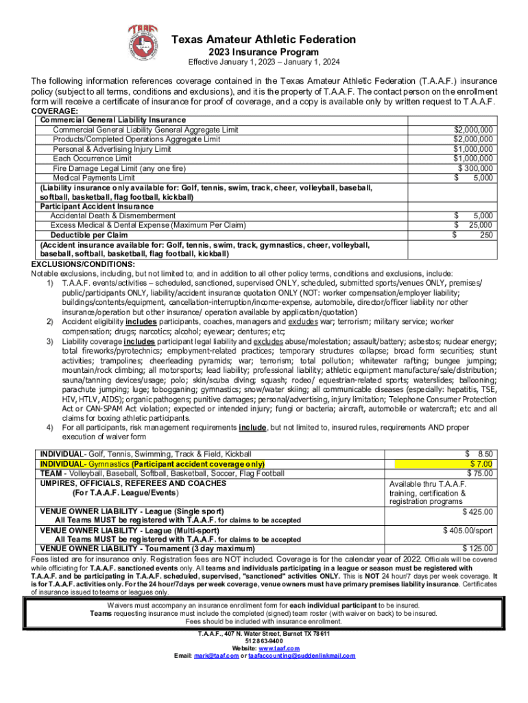 Texas Amateur Athletic Federation 2023 Insurance Program Effective January 1, 2023, January 1, 2024The following information references coverage contained in the Texas Amateur Athletic Federation