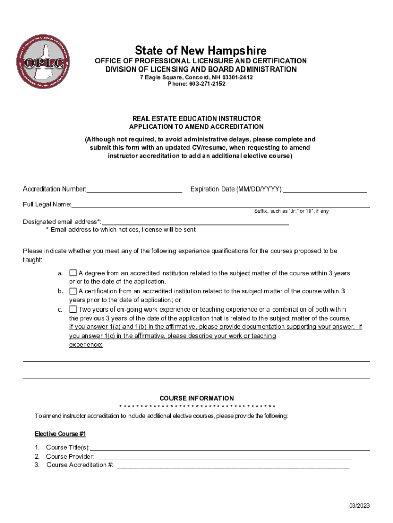 State of New HampshireOFFICE OF PROFESSIONAL LICENSURE AND CERTIFICATION DIVISION OF LICENSING AND BOARD ADMINISTRATION 7 Eagle Square, Concord, NH 033012412 Phone: 6032712152REAL ESTATE EDUCATION