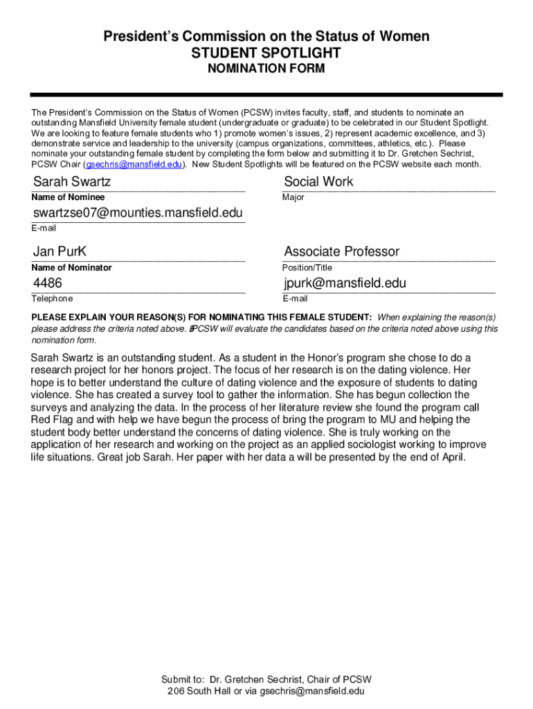 Clear formPresidents Commission on the Status of Women STUDENT SPOTLIGHT NOMINATION FORM The Presidents Commission on the Status of Women (PCs) invites faculty, staff, and students to nominate an