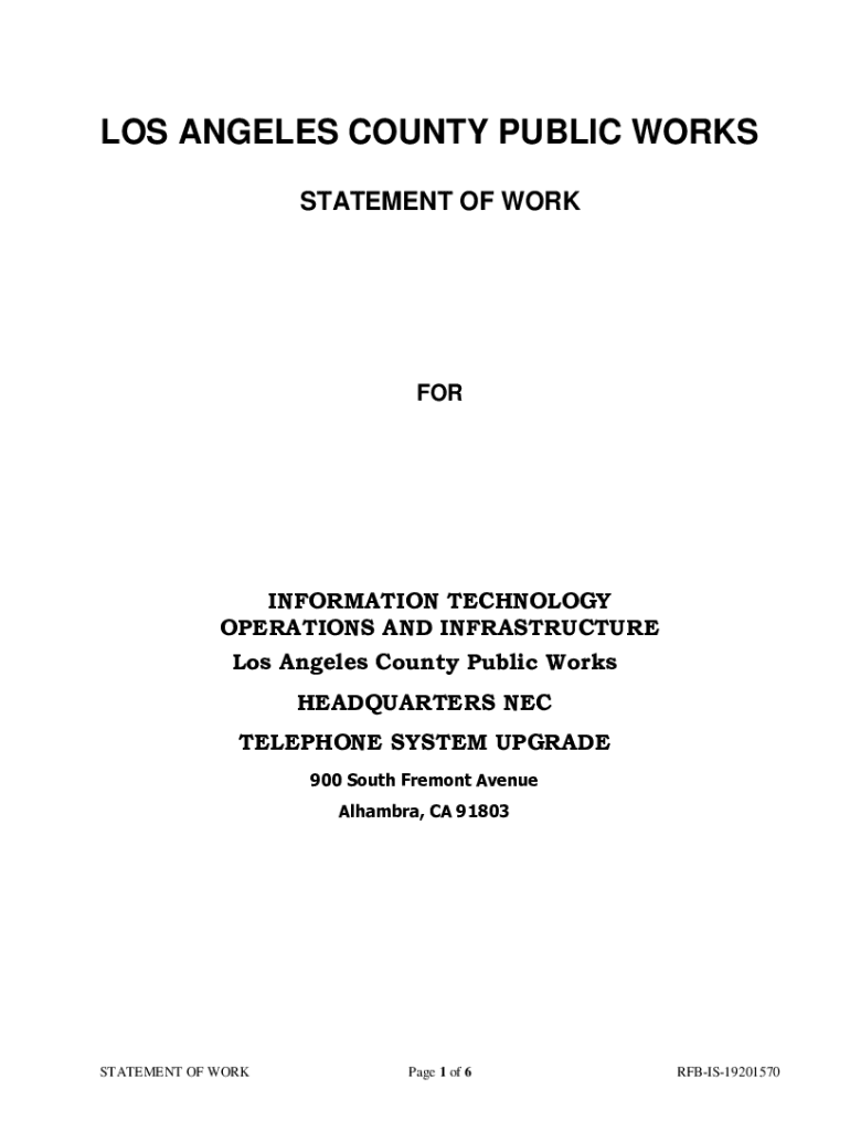 LOS ANGELES COUNTY PUBLIC WORKS STATEMENT OF WORKFORINFORMATION TECHNOLOGY OPERATIONS AND INFRASTRUCTURE Los Angeles County Public Works HEADQUARTERS NEC TELEPHONE SYSTEM UPGRADE 900 South Fremont