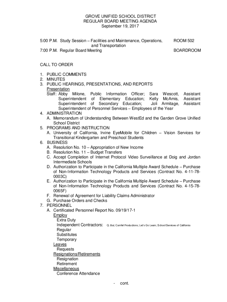 GROVE UNIFIED SCHOOL DISTRICT REGULAR BOARD MEETING AGENDA September 19, 2017 5:00 P.M. Study Session Facilities and Maintenance, Operations, and Transportation 7:00 P.M. Regular Board MeetingROOM