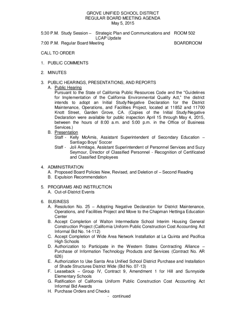 GROVE UNIFIED SCHOOL DISTRICT REGULAR BOARD MEETING AGENDA May 5, 2015 5:30 P.M. Study Session Strategic Plan and Communications and ROOM 502 CAP Update 7:00 P.M. Regular Board Meeting BOARDROOM CALL