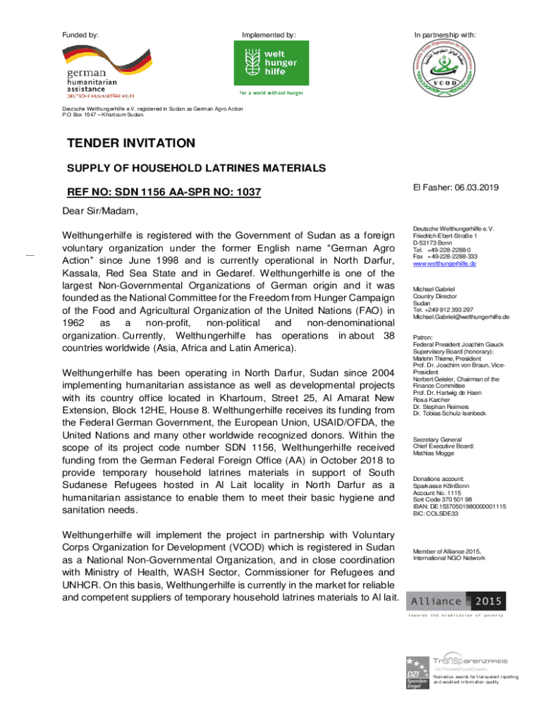 Funded by:Implemented by:In partnership with:Deutsche Welthungerhilfe e.V. registered in Sudan as German Ago Action P. O Box 1547 Khartoum Sudan. TENDER INVITATION SUPPLY OF HOUSEHOLD LATRINES MATERIALS