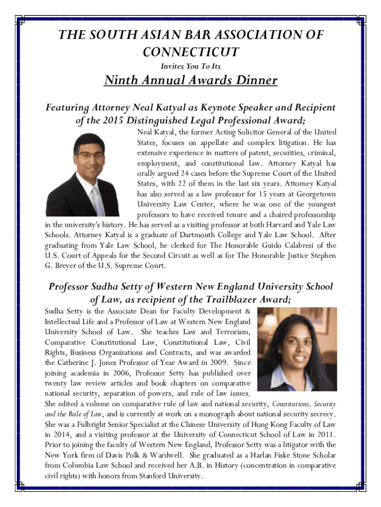 THE SOUTH ASIAN BAR ASSOCIATION OF CONNECTICUT Invites You To Ninth Annual Awards Dinner Featuring Attorney Neal Katya as Keynote Speaker and Recipient of the 2015 Distinguished Legal Professional
