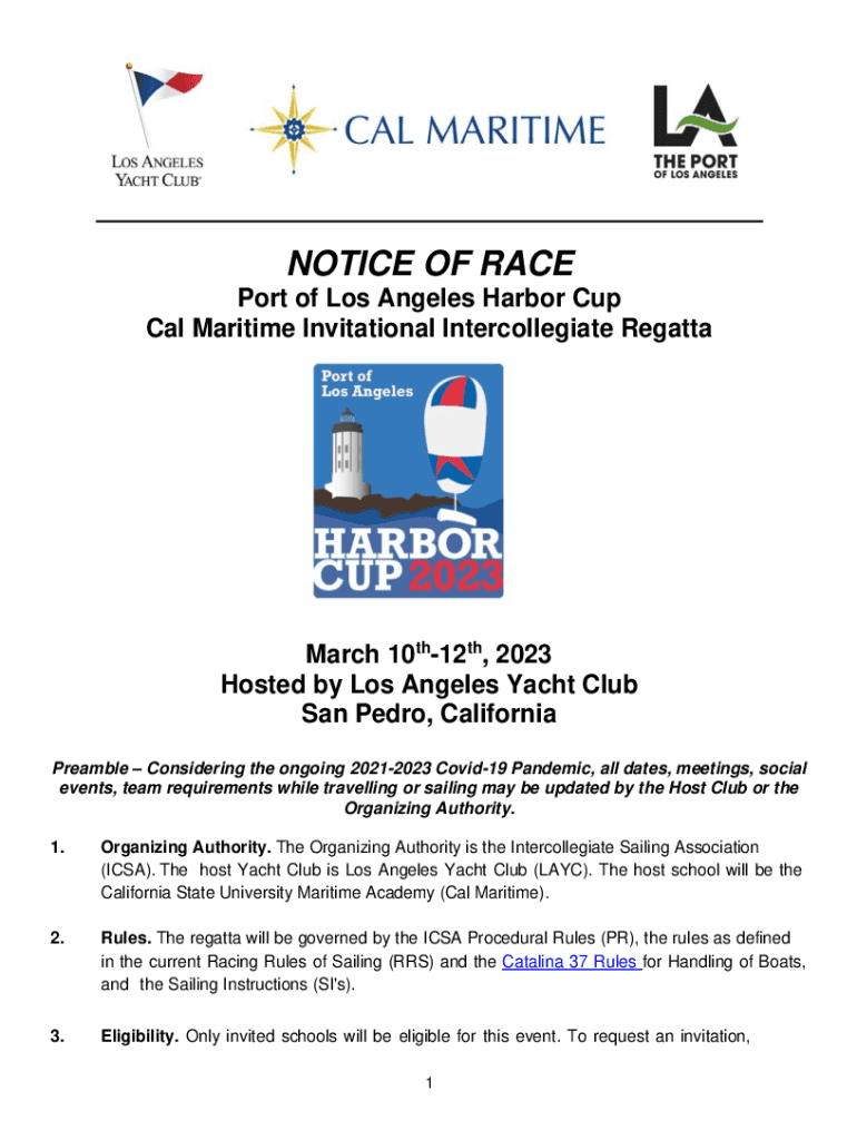 NOTICE OF RACE Port of Los Angeles Harbor Cup Cal Maritime Invitational Intercollegiate Regatta March 10th12th, 2023 Hosted by Los Angeles Yacht Club San Pedro, California Preamble Considering the