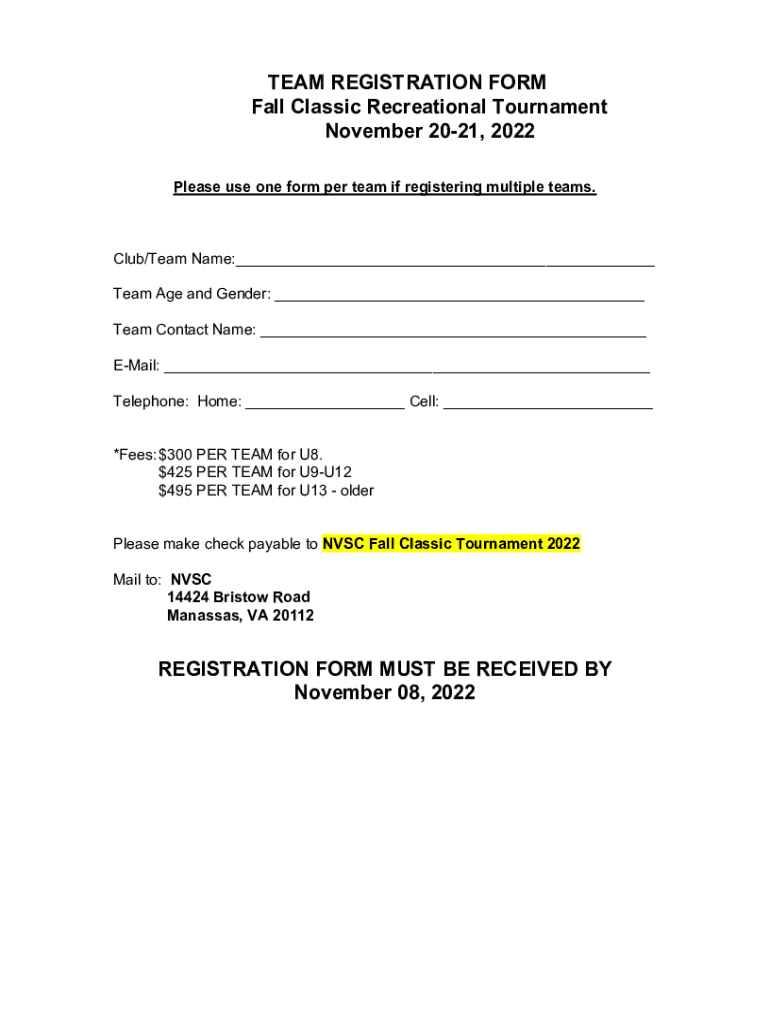 Get the free TEAM REGISTRATION FORM Fall Classic Recreational ...
