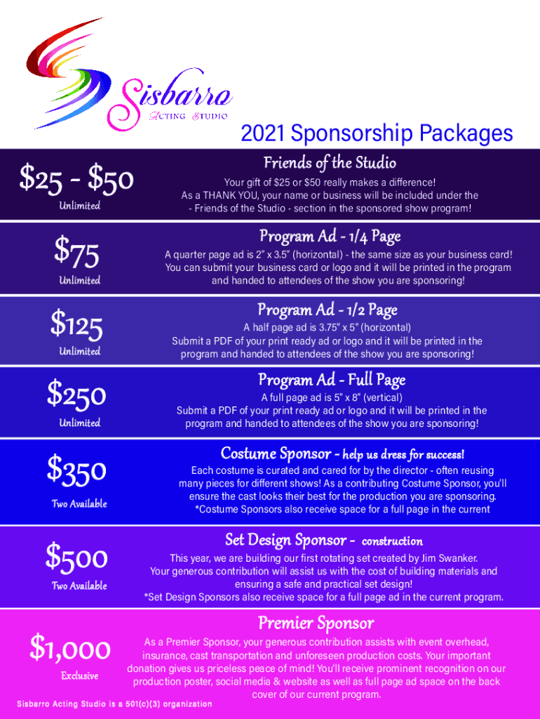 $$2550 Unlimited$75Unlimited$125 Unlimited$250 Unlimited$350 Two Available$500 Two Available$1,000 Exclusive2021 Sponsorship Packages Friends of the Studious gift of $25 or $50 really makes a difference!