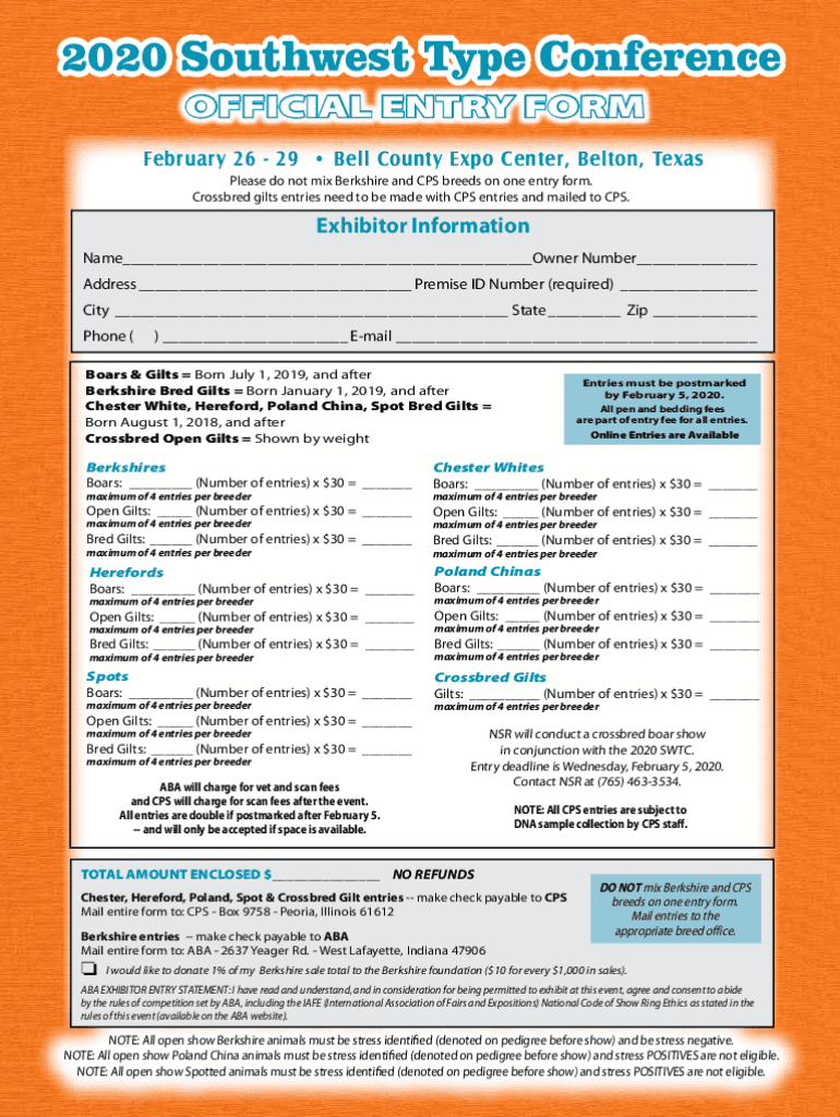 2020 Southwest Type Conference OFFICIAL ENTRY FORM February 26 29 Bell County Expo Center, Belton, Texas Please do not mix Berkshire and CPS breeds on one entry form. Crossbred gilts entries need