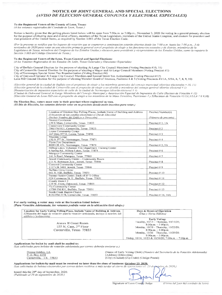 NOTICE OF JOINT GENERAL AND SPECIAL ELECTIONS (A VISA DE ELECTION GENERAL CONJ UN TA Y ELECTORAL ESPECIAL ES) To the Registered Voters of the County of Leon, Texas: (A leis rotates registrants DE/