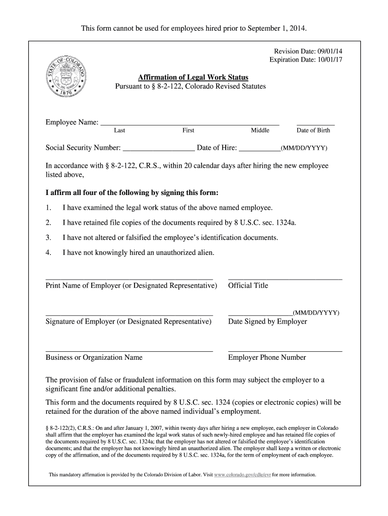 Revision Date: 09/01/14 Expiration Date: 10/01/17 Colorado Affirmation Form Instructions Employment Verification Law, 8?2?122, C.R.S. Overview of the Colorado Employment Verification Law The employment