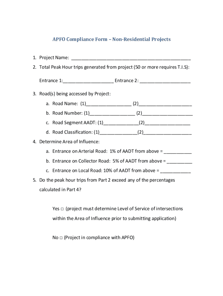 AFO Compliance Form Nonresidential Projects 1. Project Name: ___ 2. Total Peak Hour trips generated from project (50 or more requires T.I.S): Entrance 1:___ Entrance 2: ___ 3. Road(s) being accessed
