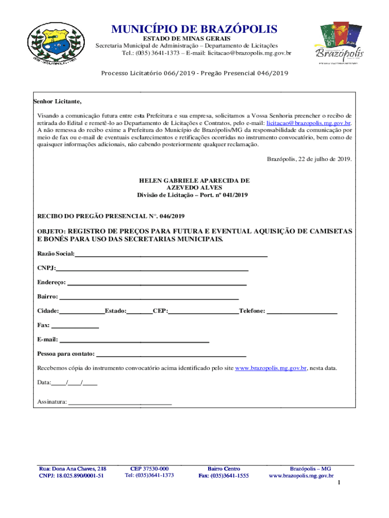 Tel.: (035) 36411373 Email: licitacao@brazopolis.mg.gov.br
