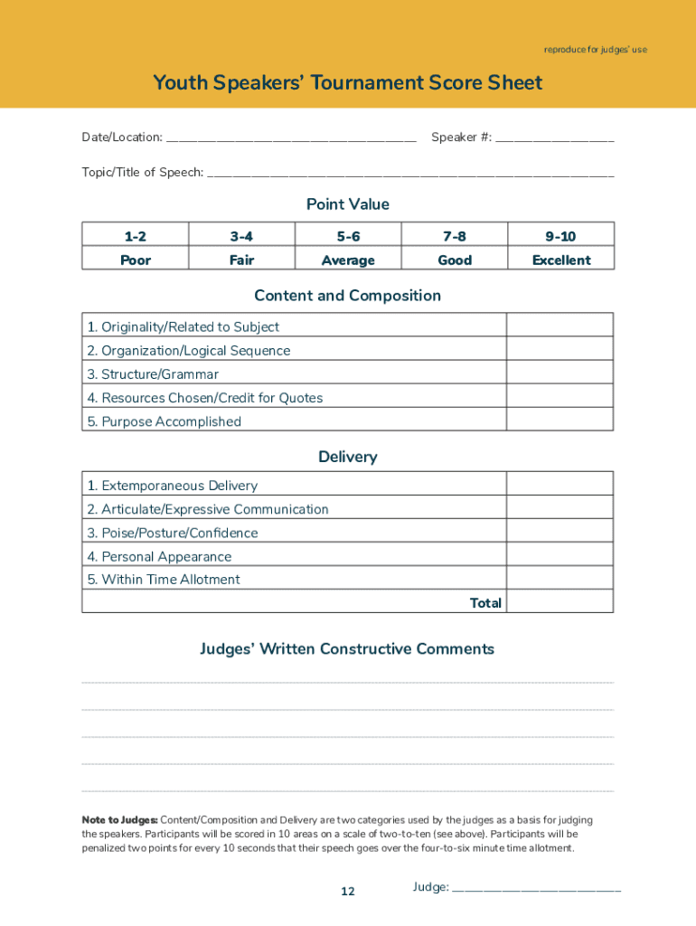 Reproduce for judges south Speakers Tournament Scoresheet Date/Location: ___Speaker #: ___Topic/Title of Speech: ___Point Value 12345678910PoorFairAverageGoodExcellentContent and Composition 1. Originality/Related