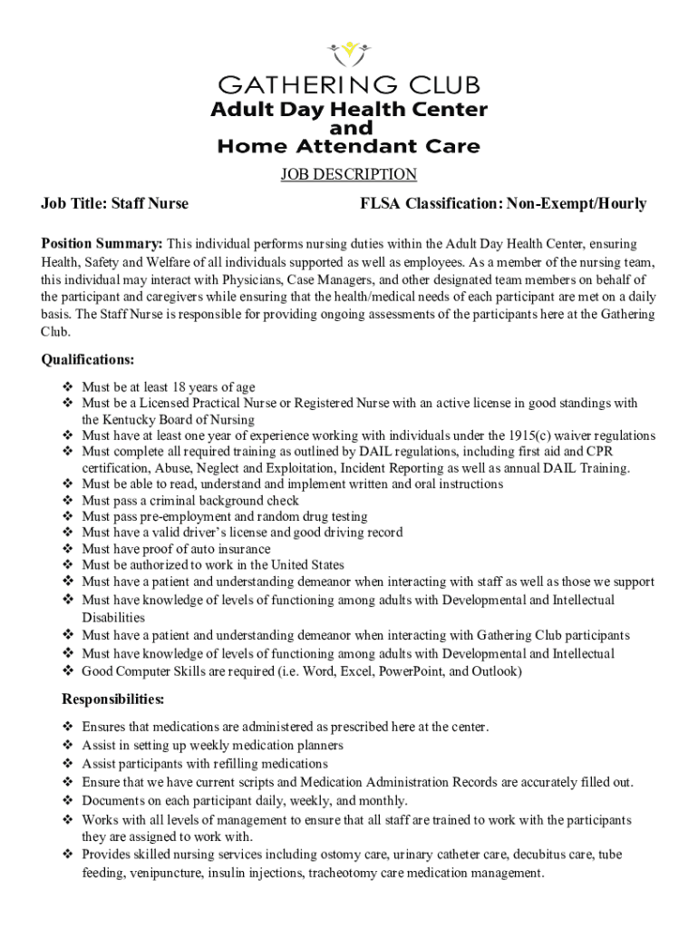JOB DESCRIPTION Job Title: Staff Nurses Classification: Nonexempt/HourlyPosition Summary: This individual performs nursing duties within the Adult Day Health Center, ensuring Health, Safety and Welfare