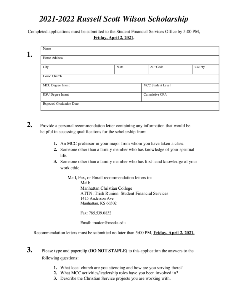20212022 Russell Scott Wilson Scholarship Completed applications must be submitted to the Student Financial Services Office by 5:00 PM, Friday, April 2, 2021. Name1. Home Address CityStateZIP CodeCountyHome