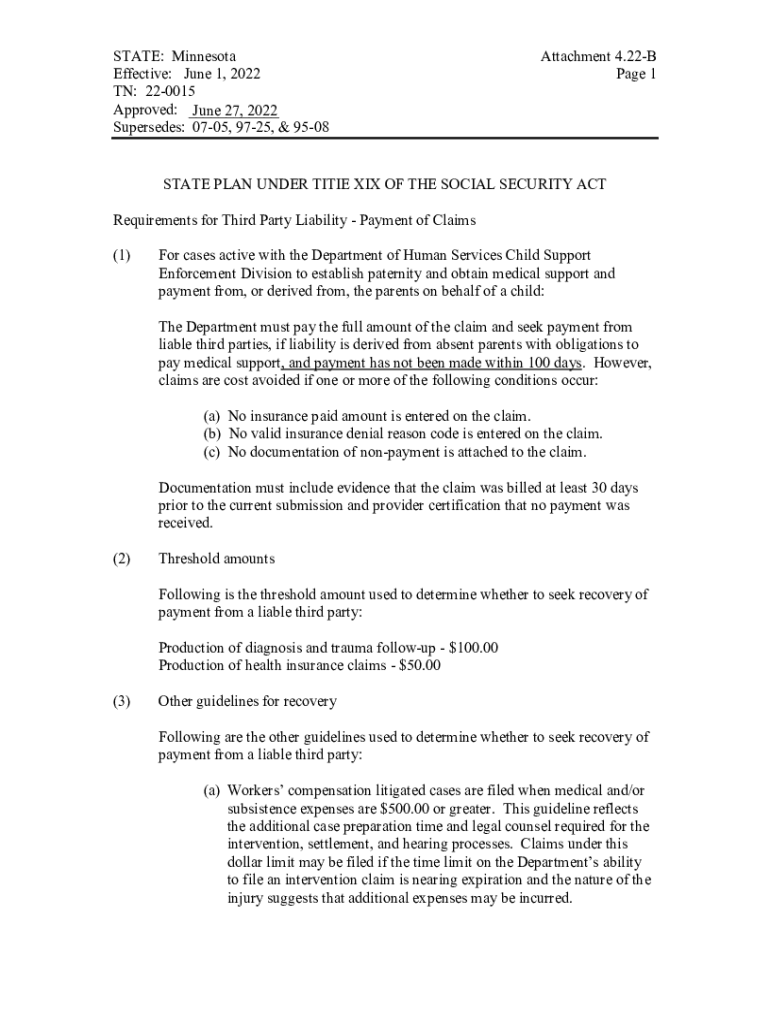 STATE: Minnesota Effective: June 1, 2022, TN: 220015 Approved: ___ June 27, 2022, Supersedes: 0705, 9725, & 9508Attachment 4.22B Page 1STATE PLAN UNDER TITLE XIX OF THE SOCIAL SECURITY ACT Requirements