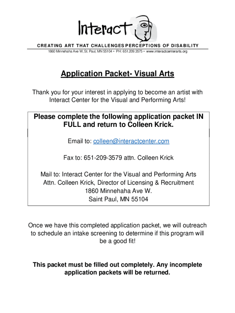 C R E AT I NG A RT T HAT C HA L E N G E S P E R C E P T I O N S O F DI S A BI L I TY 1860 Minnesota Ave W, St. Paul, MN 55104 PH: 651.209.3575 www.interactcenterarts.orgApplication Packet Visual Arts
