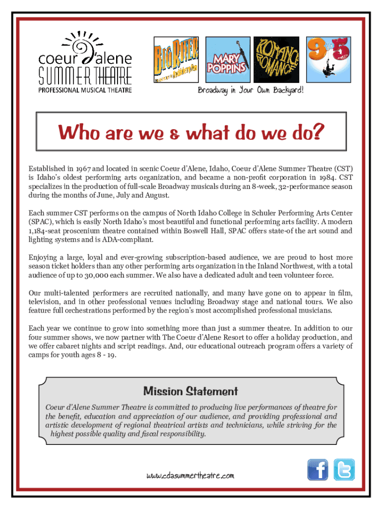 Established in 1967 and located in scenic Four Darlene, Idaho, Four Darlene Summer Theater (CST) is Idahos the oldest performing arts organization, and became a nonprofit corporation in 1984. CST