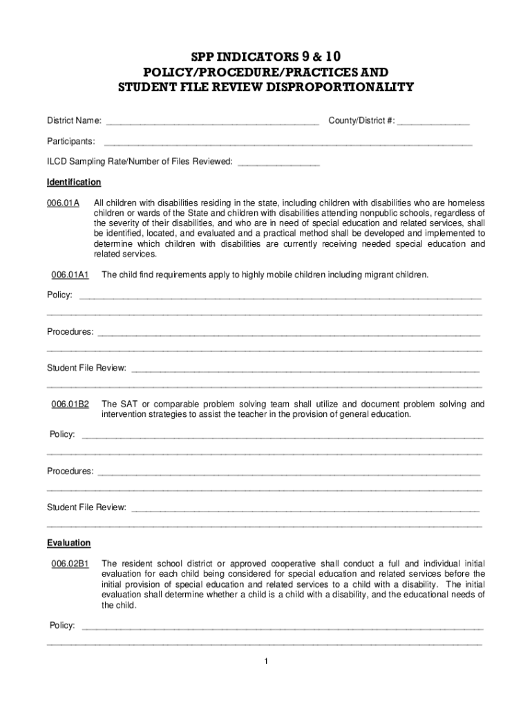SPP INDICATORS 9 & 10 POLICY/PROCEDURE/PRACTICES AND STUDENT FILE REVIEW DISPROPORTIONATE District Name: ___ Participants:County/District #: ______LCD Sampling Rate/Number of Files Reviewed: ___ Identification