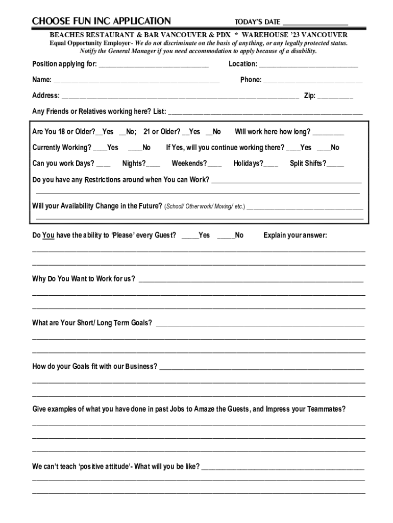 CHOOSE FUN INC APPLICATIONTODAYS DATE ___BEACHES RESTAURANT & BAR VANCOUVER & PDX * WAREHOUSE 23 VANCOUVER Equal Opportunity Employer We do not discriminate on the basis of anything, or any legally