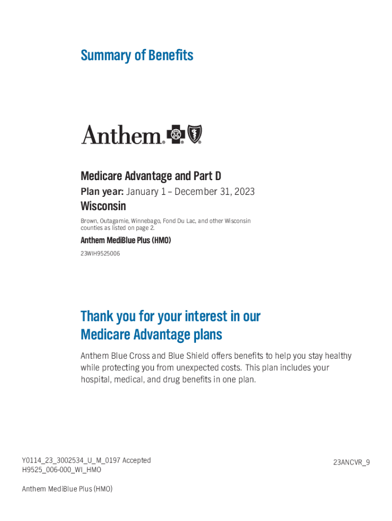 Summary of Benefits Medicare Advantage and Part D Plan year: January 1 December 31, 2023Wisconsin Brown, Outage, Winnebago, Fond du Lac, and other Wisconsin counties as listed on page 2. Anthem Edible