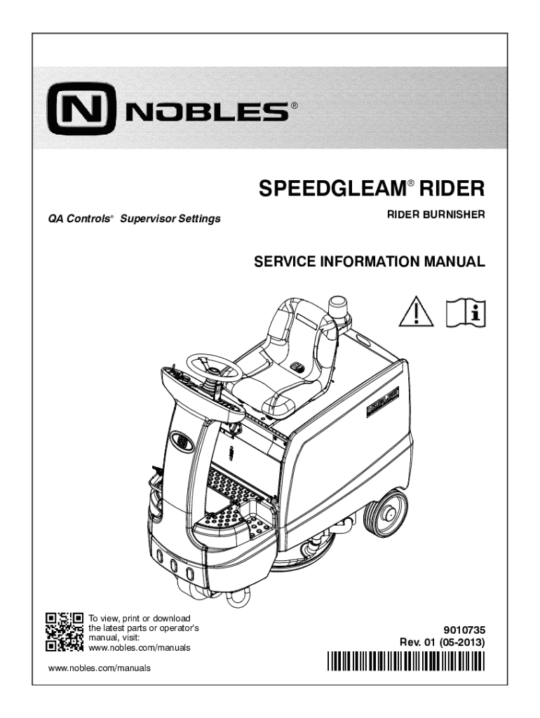 SPEEDGLEAM RIDER QA Controls Supervisor Settings RIDER BURNISHERSERVICE INFORMATION Manual view, print or download the latest parts or operators manual, visit: www.nobles.com/manuals www.nobles.com/manuals9010735