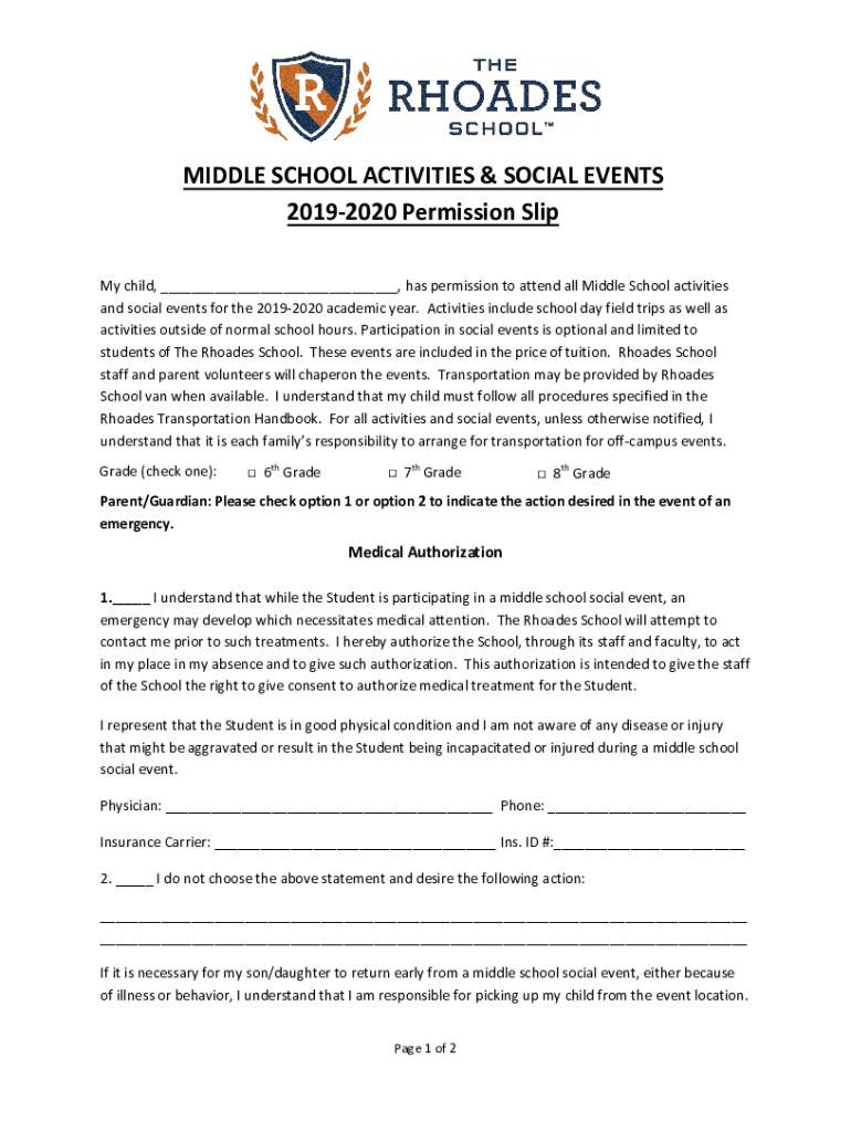 MIDDLE SCHOOL ACTIVITIES & SOCIAL EVENTS 20192020 Permission Slip My child, ___, has permission to attend all Middle School activities and social events for the 20192020 academic year. Activities