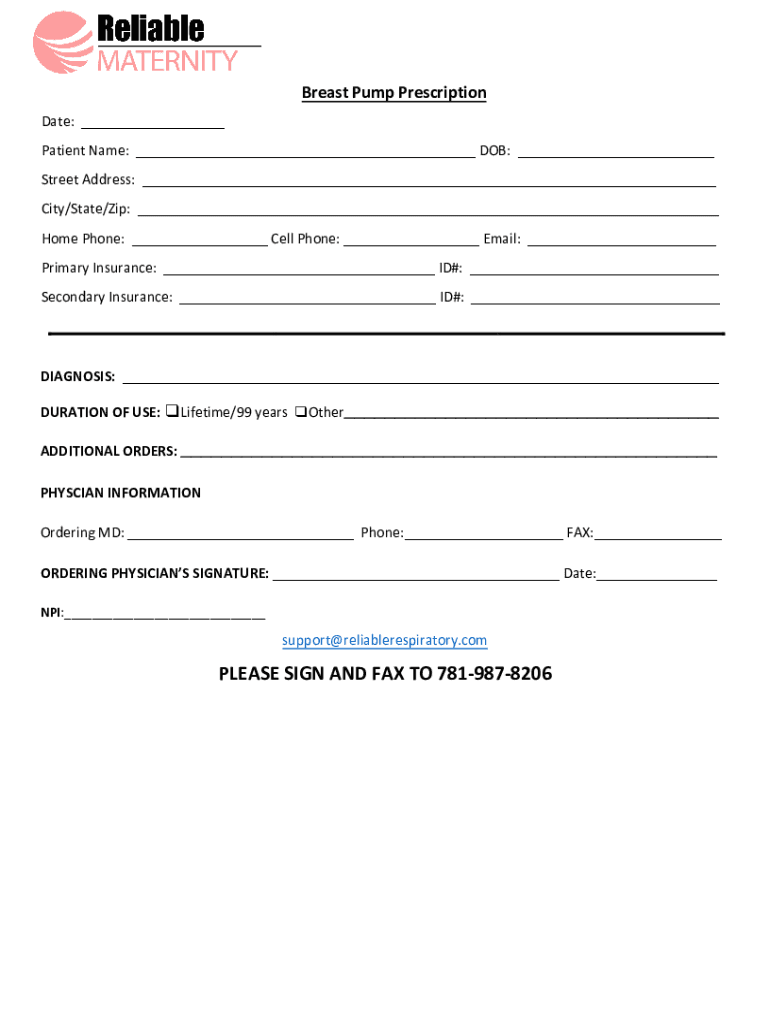 Breast Pump Prescription Date: ___ Patient Name: ___ DOB: ___ Street Address: ___ City/State/Zip: ___ Home Phone: ___ Cell Phone: ___ Email: ___ Primary Insurance: ___ ID#: ___ Secondary Insurance: