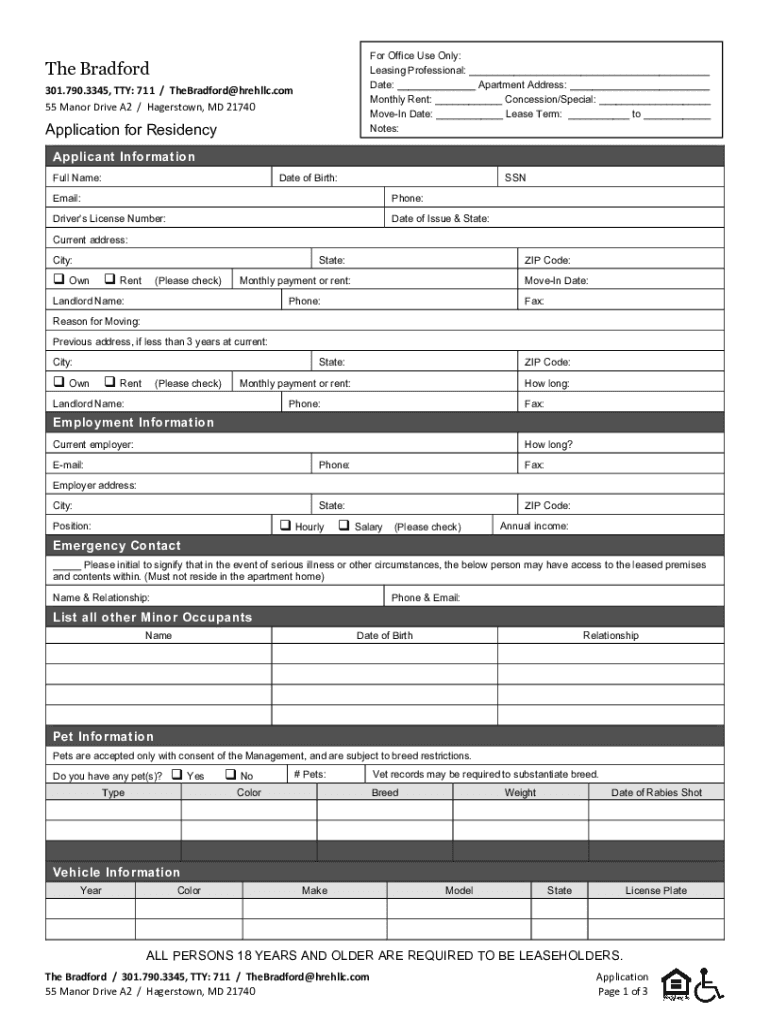 For Office Use Only: Leasing Professional: ___ Date: ___ Apartment Address: ___ Monthly Rent: ___ Concession/Special: ___ Move In Date: ___ Lease Term: ___ to ___ Notes:The Bradford 301.790.3345,