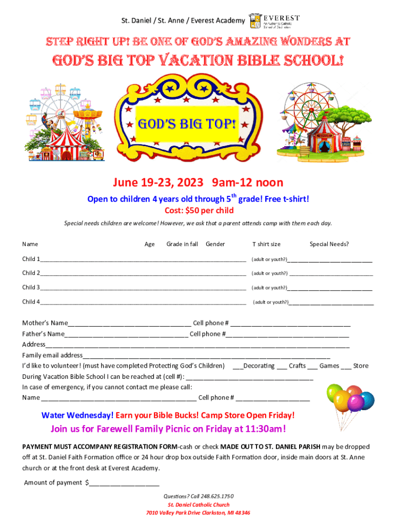 St. Daniel / St. Anne / Everest AcademyStep Right Up! Be One Of gods Amazing Wonders Gods Big top Vacation Bible School!gods Big top! June 1923, 2023 9am12 noon