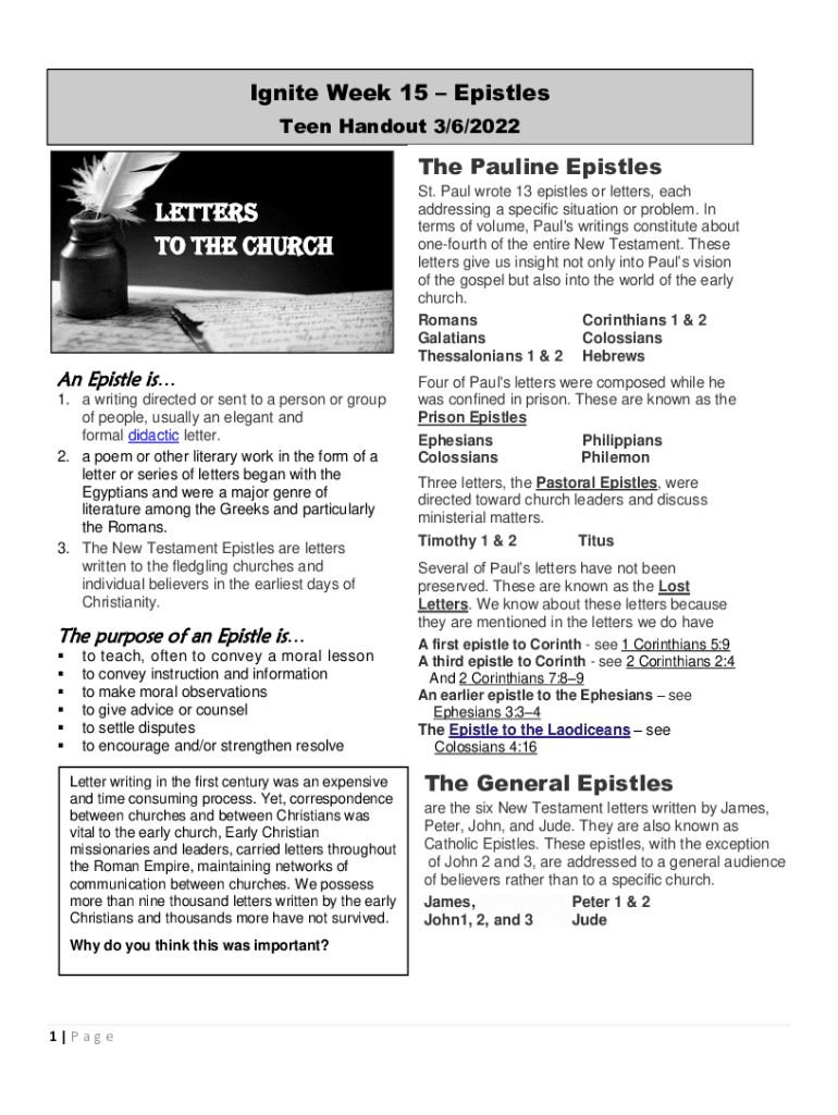 Ignite Week 15 Epistles Teen Handout 3/6/2022The Pauline EpistlesLetters To the Churchman Epistle is 1. A writing directed or sent to a person or group of people, usually an elegant and formal didactic
