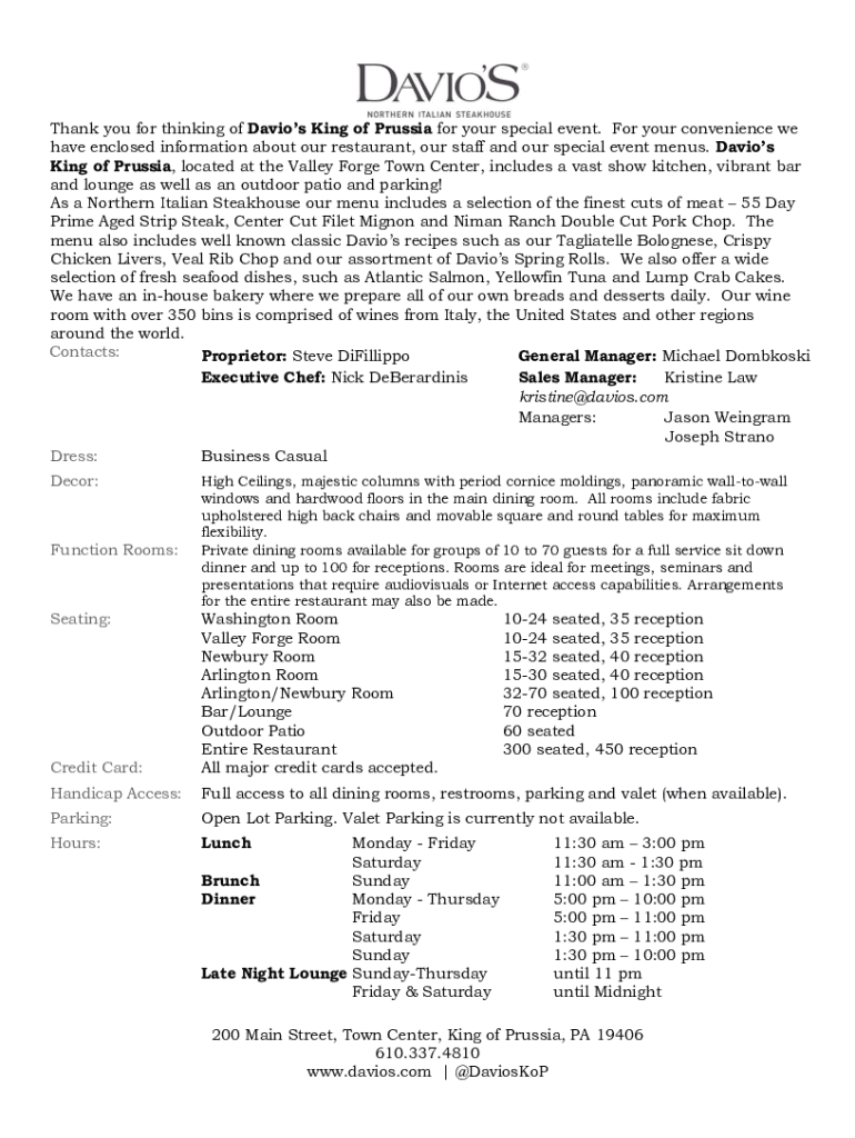Thank you for thinking of Davis King of Prussia for your special event. For your convenience we have enclosed information about our restaurant, our staff and our special event menus. Davis King of