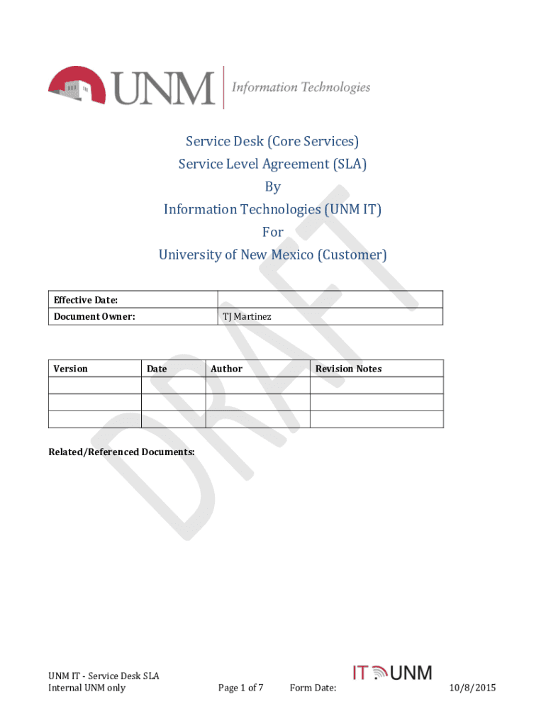 Service Desk (Core Services) Service Level Agreement (SLA) By Information Technologies (UNM IT) For University of New Mexico (Customer) Effective Date: Document Owner:Version TJ MartinezDateAuthorRevision