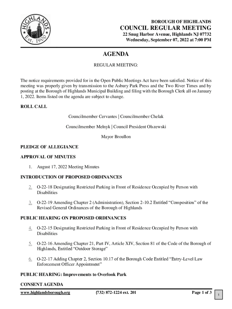 BOROUGH OF HIGHLANDSCOUNCIL REGULAR MEETING 22 Snug Harbor Avenue, Highlands NJ 07732 Wednesday, September 07, 2022, at 7:00 AGENDA REGULAR MEETING: The notice requirements provided for in the Open