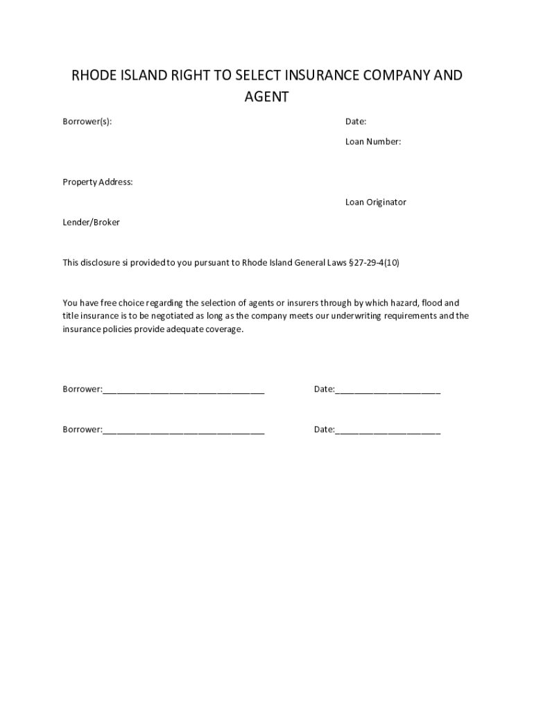 RHODE ISLAND RIGHT TO SELECT INSURANCE COMPANY AND AGENT Borrower(s):Date: Loan Number:Property Address: Loan Originator Lender/Brokers disclosure is provided to you pursuant to Rhode Island General