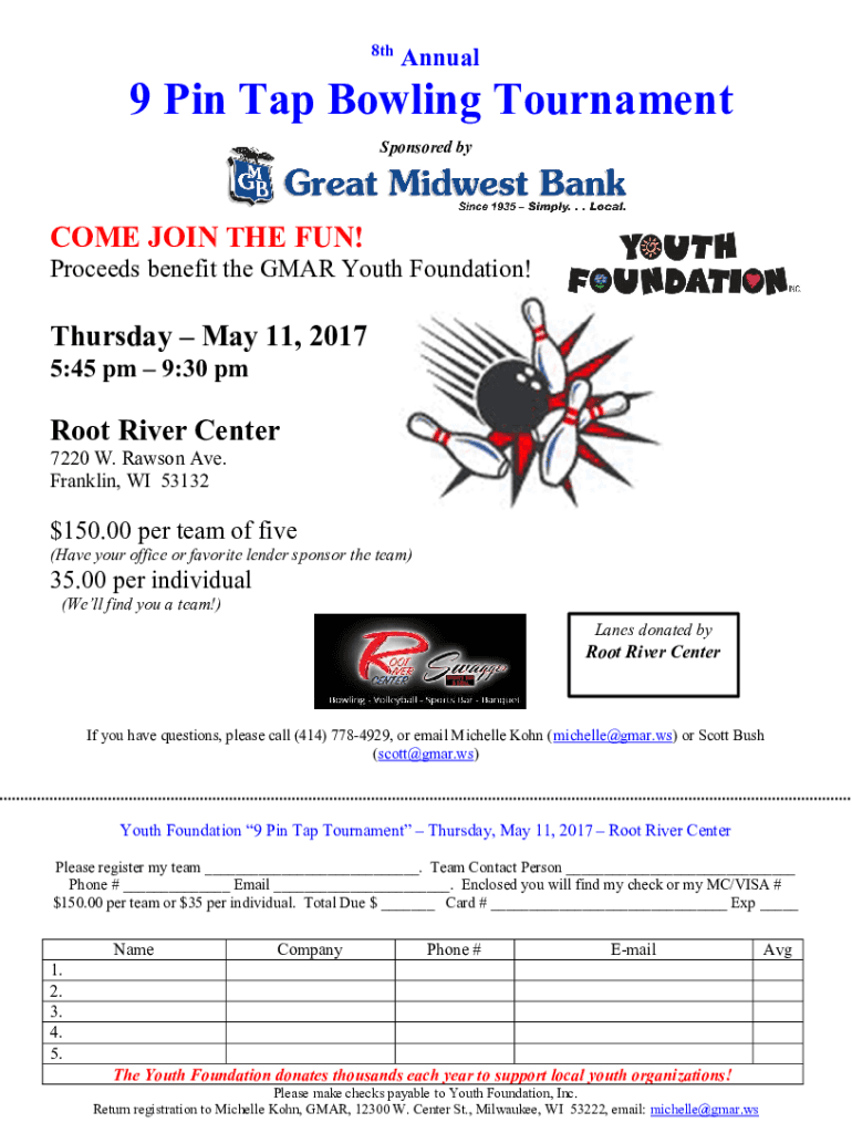 8thAnnual9 Pin Tap Bowling Tournament Sponsored become JOIN THE FUN! Proceeds benefit the GEAR Youth Foundation! Thursday, May 11, 2017 5:45 pm 9:30 pm Root River Center 7220 W. Rawson Ave. Franklin,