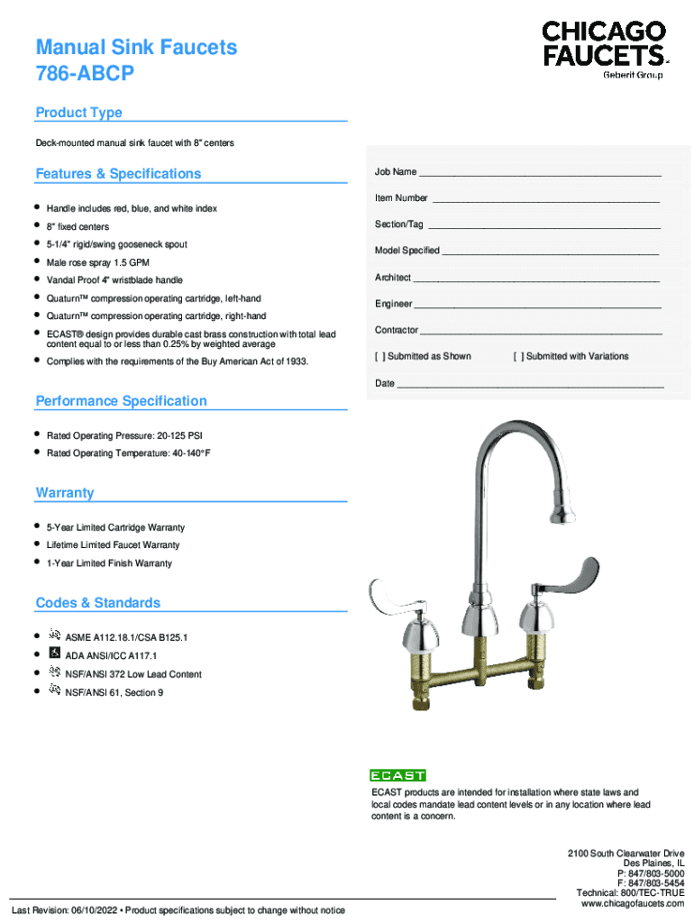 Manual Sink Faucets 786ABCP Product Type Deck mounted manual sink faucet with 8\” centersFeatures & Specifications Job Name ___ Item Number ___Handle includes red, blue, and white index 8\” fixed