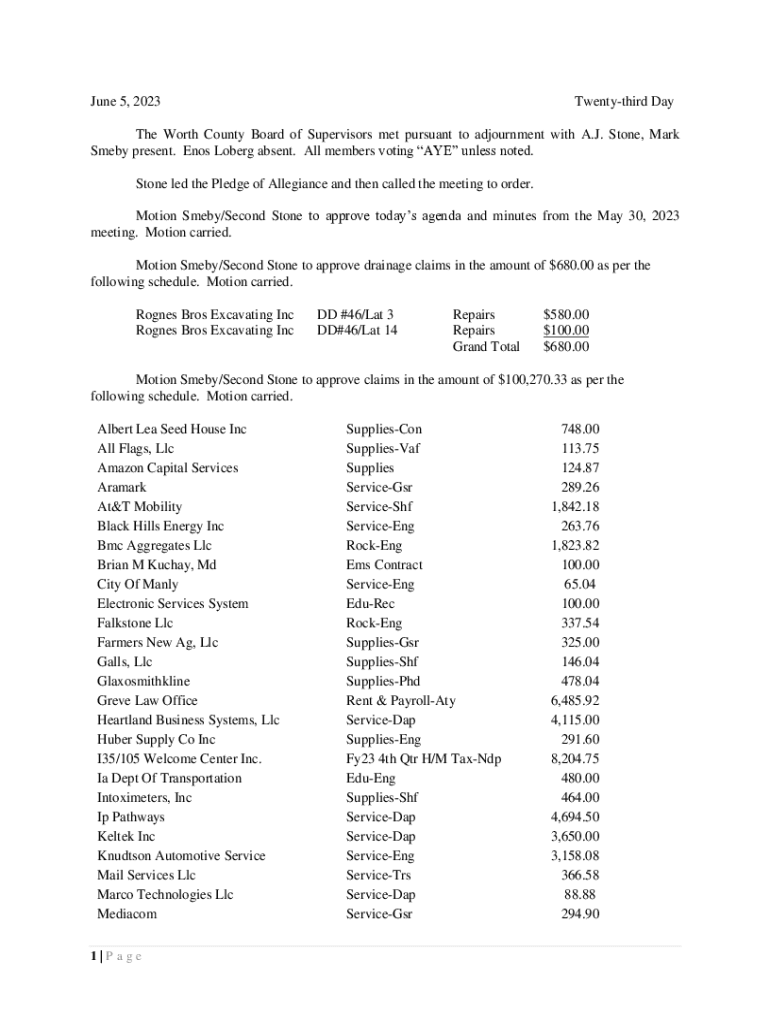 June 5, 2023Twentythird Date Worth County Board of Supervisors met pursuant to adjournment with A.J. Stone, Mark Smell present. Enos Lob erg absent. All members voting AYE unless noted. Stone led